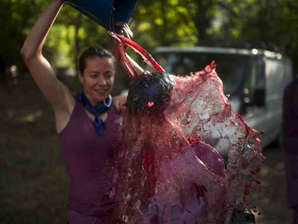 ↑6月29日,在西班牙阿罗,一名女士在“葡萄酒大战”中将酒倾倒在一个男孩头上。新华社/路透