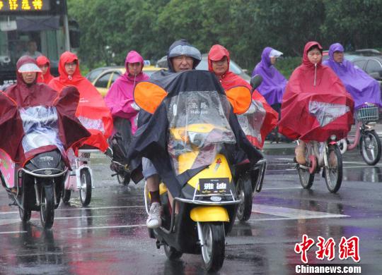 6月30日傍晚,骑车的市民穿着雨披在南京街头经过。南京自从入梅以来,持续多日降雨,雨水间歇性时断时续,给市民的出行带来极大的不便。