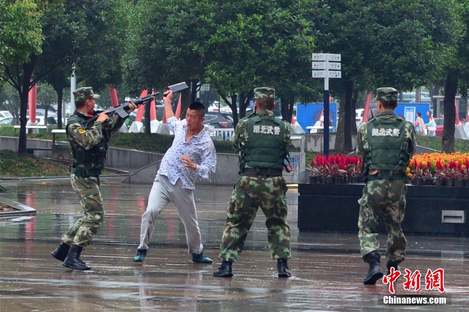 6月30日,湖北宜昌市公安局联合武警、铁路公安等部门在宜昌火车东站广场进行反恐演练。演练假设两名歹徒在火车站广场安置爆炸物并持刀砍人,被巡逻的武警制服一名,击毙一名。受伤群众被送往医院后,排爆机器人进场,宜昌特警支队安检防爆大队民警开始进行排爆,几分钟后,爆炸物被顺利处置。刘康 摄