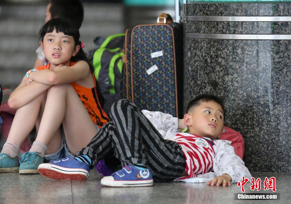2015年铁路暑运大幕将于7月1日正式拉开,江西南昌连续多日持续高温“桑拿”天气,不少出行旅客在出行候车期间想尽方法纳凉避暑。6月30日,南昌火车站广场前及售票大厅里,不少出行旅客在有冷气的售票大厅或地下出站口周围“躲避”高温,还有的旅客耐不住困意就地寻找阴凉处午休。姜涛 摄
