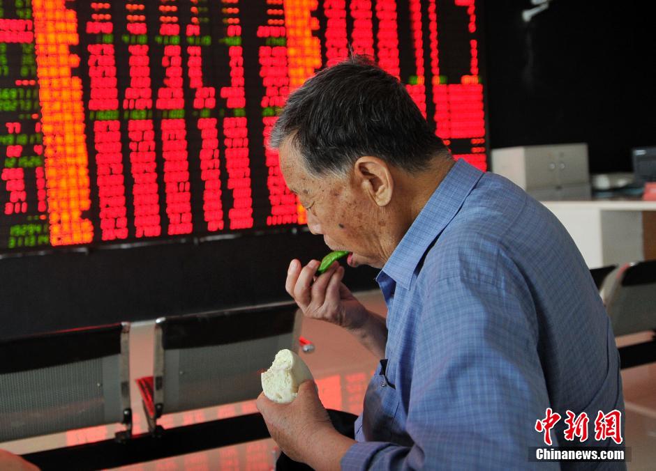 7月1日,山西太原一证券交易所,股民在中午收市后匆匆用馒头配青椒当做午餐。当日早盘,沪深两市小幅低开呈现宽幅震荡,沪指一度突破4300点,创业板指重夺3000点大关,随后大盘有所回落。 中新社发 韦亮 摄