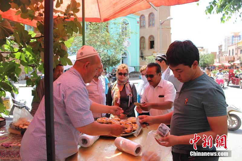 14时许,烤包子生意红火。专做烤包子生意的卡德尔江在老城开了14年的店,远近闻名,每天销售额在8000元至12000元不等。朱景朝 摄