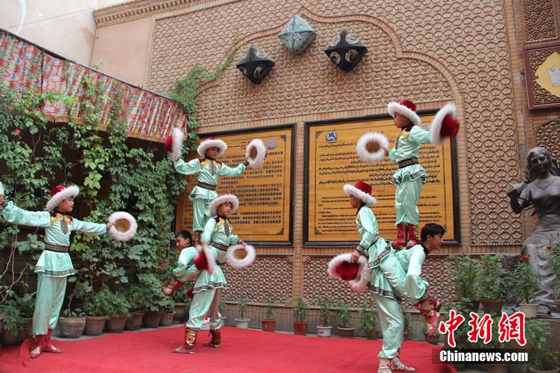 18时许,老城里举行帽子舞表演。喀什老城景区已进入旅游旺季,每天都会有地方特色文化表演。因为花帽深受维吾尔族民众喜爱,花帽舞表演可展示维吾尔文化。朱景朝 摄