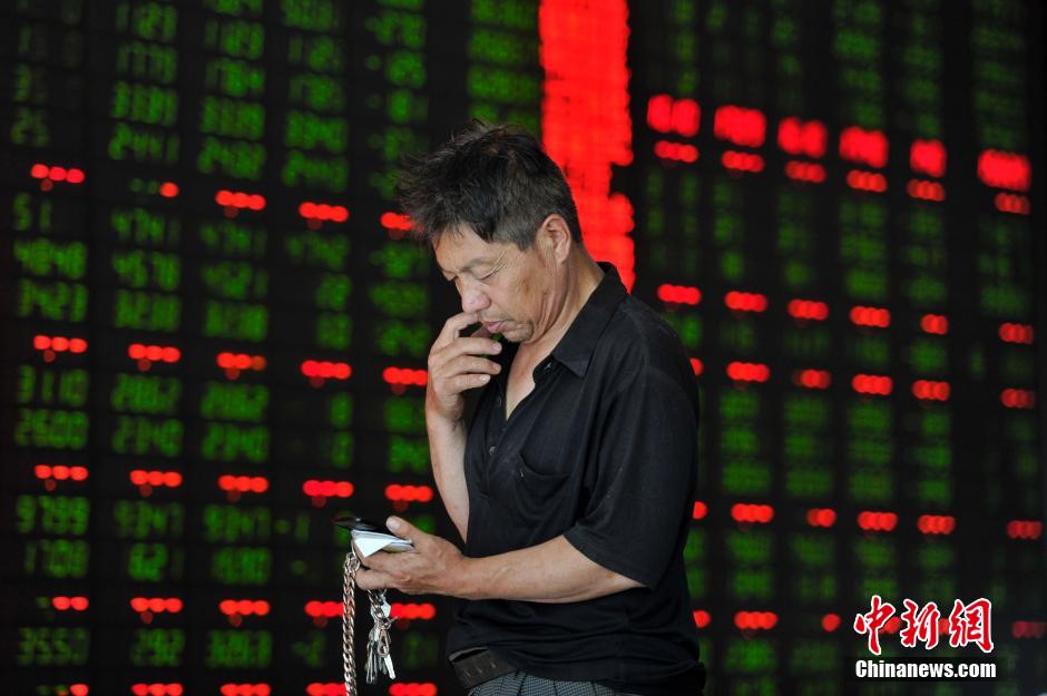 7月2日,山西太原一证券交易所,巨震下跌的沪指走势让股民苦不堪言,大盘一片绿。中新社发 韦亮 摄