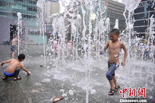 图为小孩穿梭在正在运行的喷泉中。陈超 摄