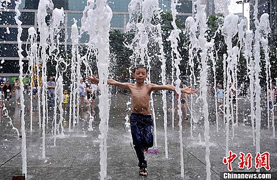7月2日,重庆解放碑步行街上不少小孩穿梭在正在运行的喷泉中寻清凉。当日,重庆主城室外气温超30℃。