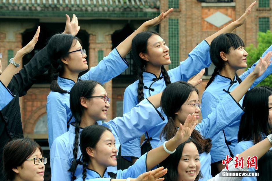 7月4日,中山大学2015届毕业典礼暨2015年学位授予仪式在南校区梁球锯堂举行,14073名毕业生将从这里接过走出校门,迈向新的征程。在学位授予仪式后,学子们纷纷合影留念。毕业生们身穿具有民国特色的服装合影留念。 中新社发 梁永强 摄