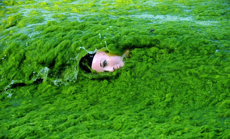 2015年7月4日,山东青岛,随海浪冲击到岸边的浒苔。持续的南风将山东青岛外海的大面积浒苔吹到近海,沿海海岸堆积的浒苔似一条长长的绿化带。图为一个橡胶人头像夹杂在被海浪冲击的浒苔中。