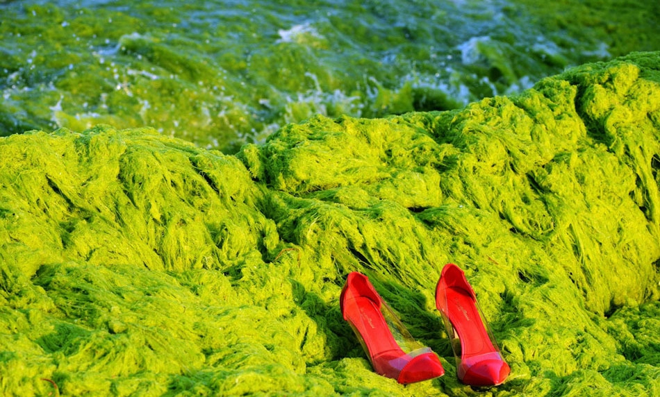 一双游客的红色高跟鞋放在海边的浒苔上。