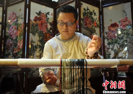 7月8日,山西太原,苏绣大师沈德龙现场手工刺绣。韦亮 摄
