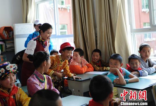 国航空姐志愿者与藏区孩子们互动。 安源 摄