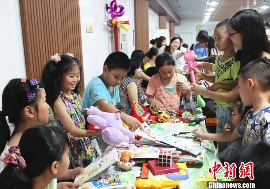 图为纳凉点内,小朋友们在家长的带领下参加旧物置换活动。 周毅 摄