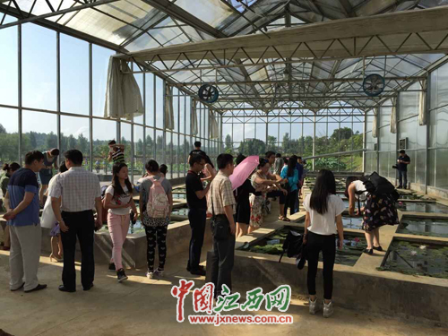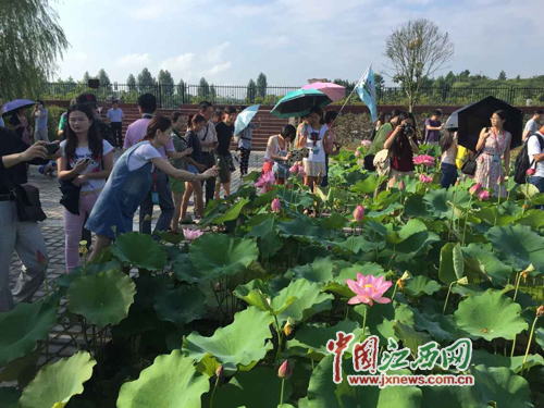 中国江西网讯 记者李运辉报道:7月12日,来自全国40余家重点网媒的记者们来到莲花科技博览园,园中从国外引种的400多个莲花品种竞相绽放,吸引了大批的网媒记者争相拍照合影。