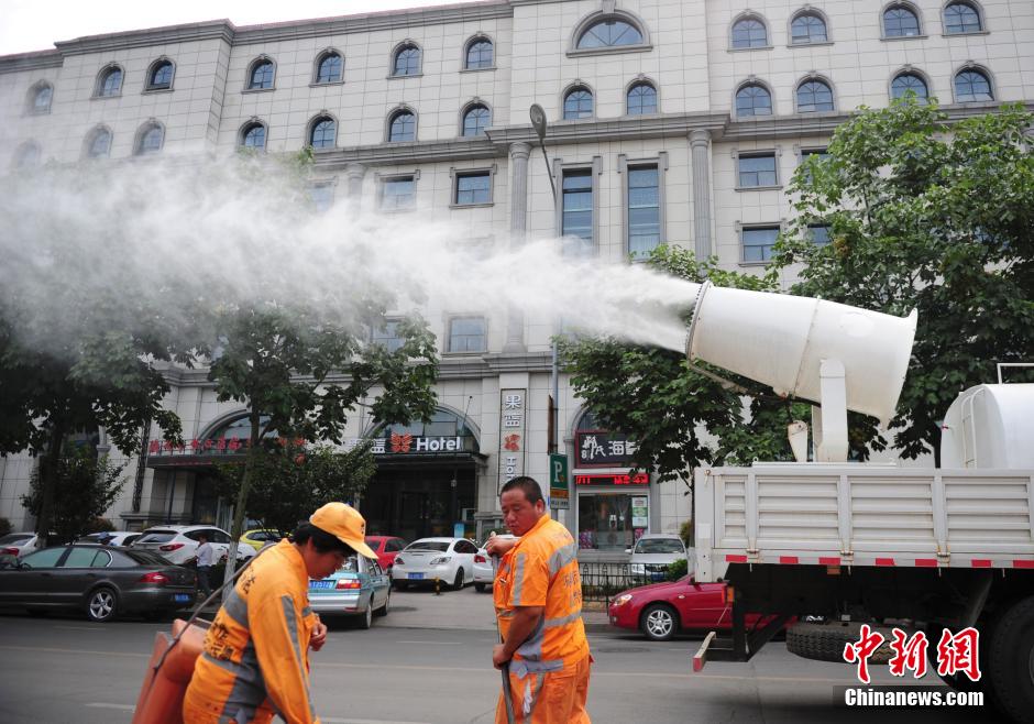 7月13日,“入伏”首日,济南发布高温橙色预警信号,近40℃高温“蒸烤”济南,济南明水幼儿园自动气象站16时实况气温一度达到41.5℃。为此,济南历下区城管局出动“雾炮车”喷雾降温。图为“雾炮车”喷出的水雾给环卫工带来些许清凉。中新社发 张勇 摄
