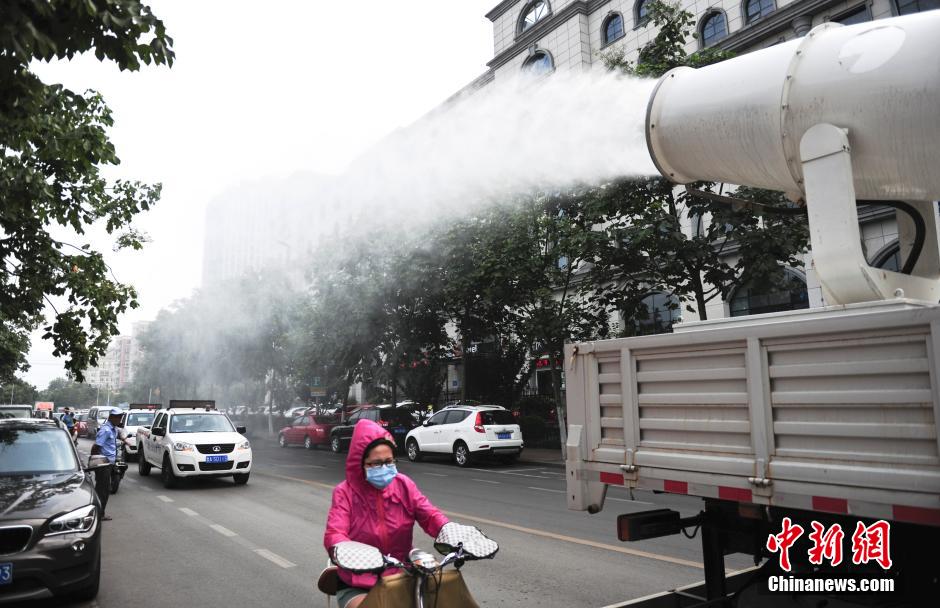 7月13日,“入伏”首日,济南发布高温橙色预警信号,近40℃高温“蒸烤”济南,济南明水幼儿园自动气象站16时实况气温一度达到41.5℃。为此,济南历下区城管局出动“雾炮车”喷雾降温。图为市民“雾”中骑行享清凉。中新社发 张勇 摄