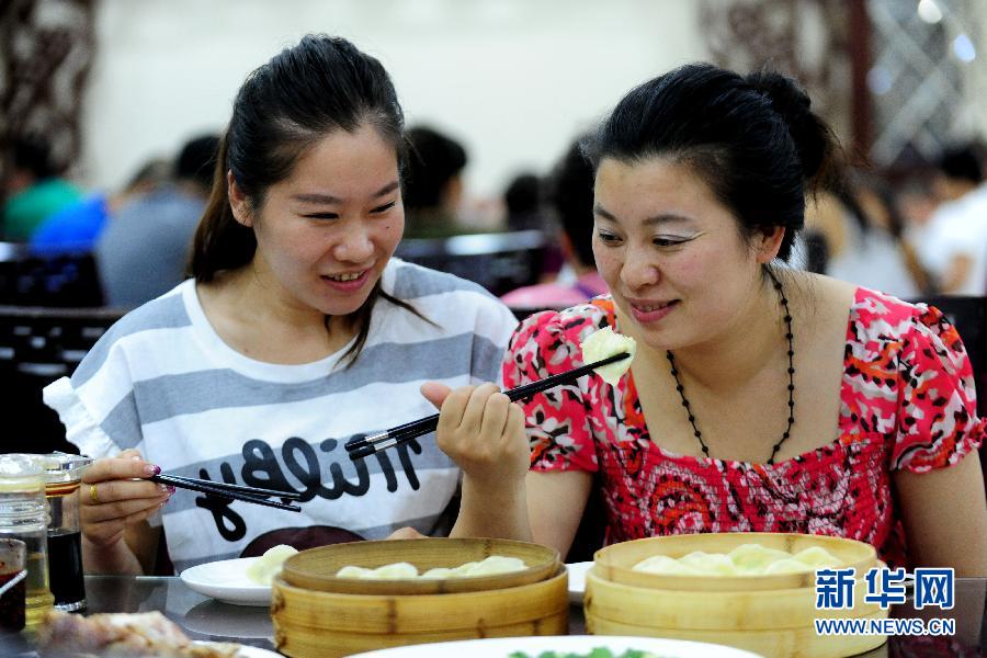 7月13日,在“中华老字号”沈阳老边饺子馆里,顾客在品尝“头伏饺子”。当日是三伏第一天,我国多地有头伏吃饺子的传统民俗。 新华社发(张文魁 摄)