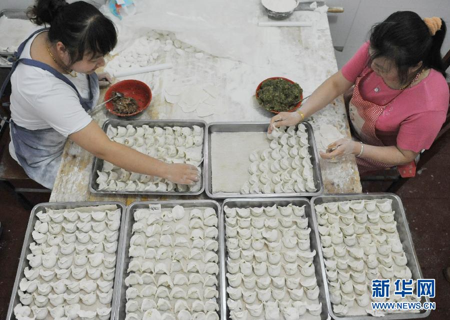7月13日,在浙江省临安市一家饺子馆内,工作人员在包“头伏饺子”。 当日是三伏第一天,我国多地有头伏吃饺子的传统民俗。新华社发(胡剑欢 摄)