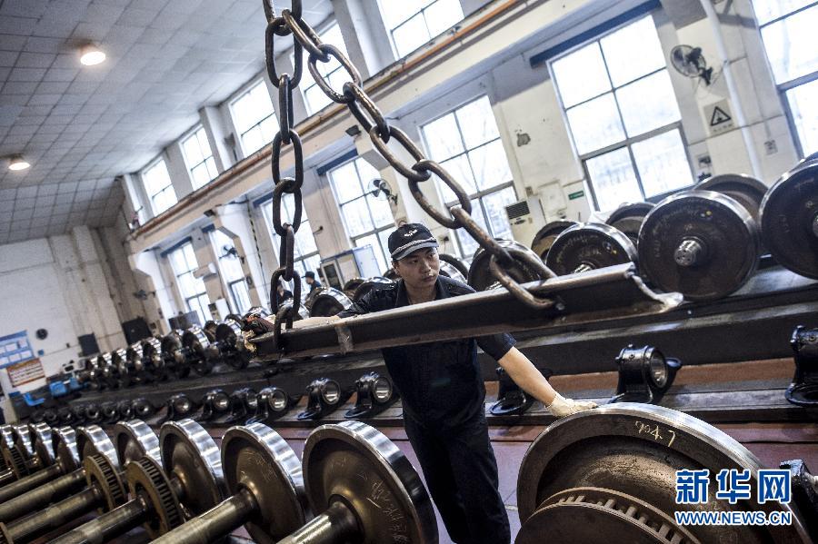 7月13日,检修员高志在调运待组装车轮。新华社记者肖艺九摄