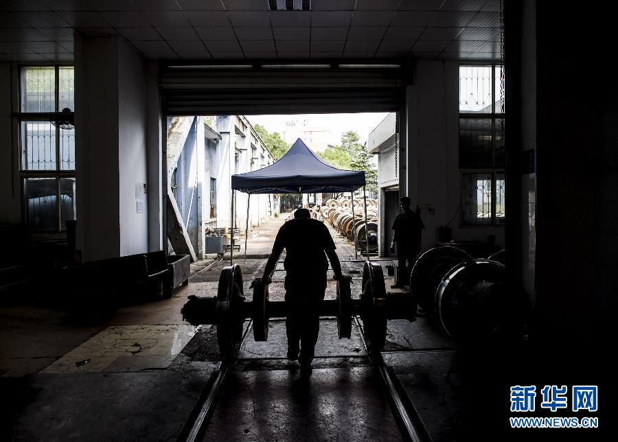 7月13日,一名检修员将检修好的车轮转运组装。新华社记者肖艺九摄