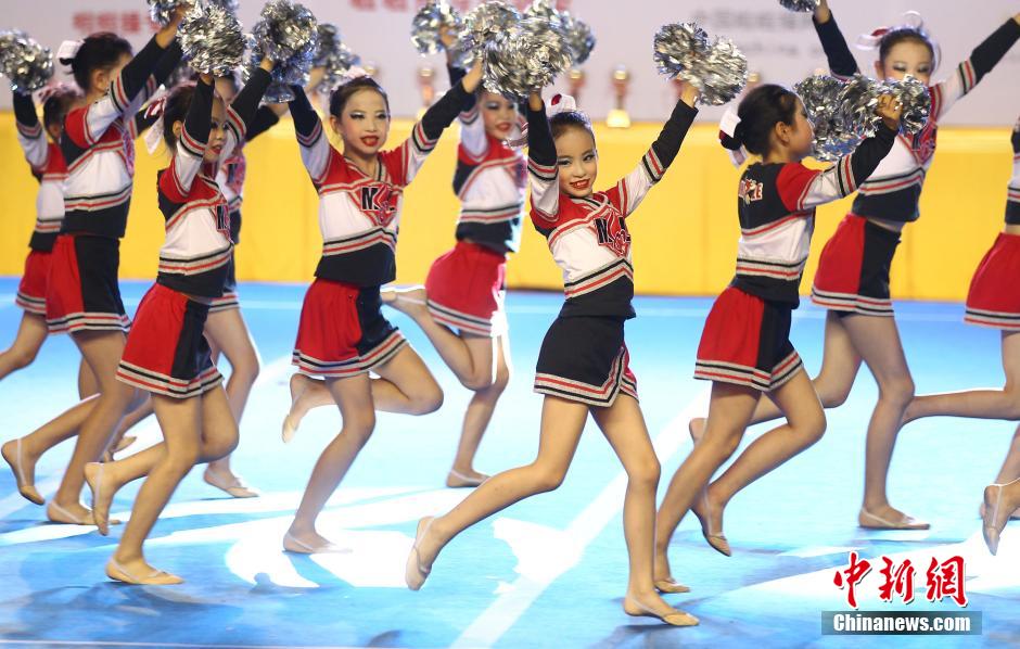 7月17日,参加小学组啦啦操比赛的选手在进行比赛中。当日,2014-2015全国啦啦操联赛总决赛在南京工业大学开赛,来自全国各地的啦啦操队将分别参加幼儿、小学、中学和大学以及俱乐部组,同台竞技尽展活力。据悉,同期还将举办中国啦啦之星争霸赛总决赛、中国啦啦操公开赛等赛事。 中新社发 泱波 摄