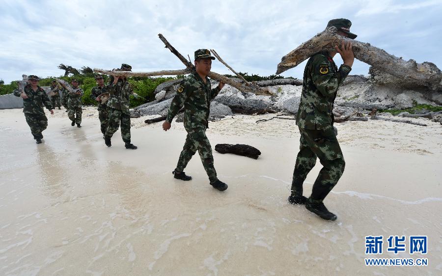7月17日,三沙市公安边防支队蓝丝带志愿服务队官兵在三沙永兴综合港码头外侧的海滩上捡拾垃圾。当日,成立于2015年6月24日的三沙市首支蓝丝带志愿者服务队中的边防官兵们在三沙市进行清理海滩义务劳动。 新华社记者 赵颖全 摄