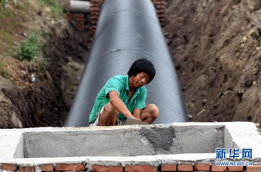 7月17日,在香河县钳屯镇污水处理管道铺设现场,工人在砌管道查看口。河北香河县为保护农村水源安全,在农村铺设污水排放管网,建立污水处理站,通过一级物理处理、二级生化处理,有效治理区域性水体污染问题。新华社记者 李晓果 摄