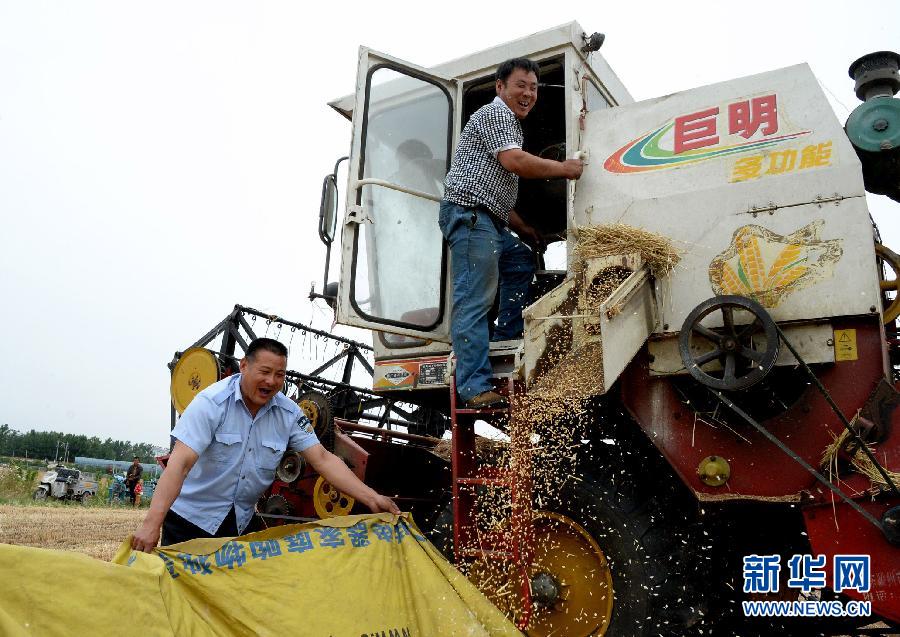 山东省滕州市东沙河镇小宫山村村民收获小麦(6月4日摄)。记者近日从山东省有关部门了解到,山东2015年夏粮总产234.73亿公斤,比上年增加8.28亿公斤,喜获丰收。 新华社记者冯杰摄