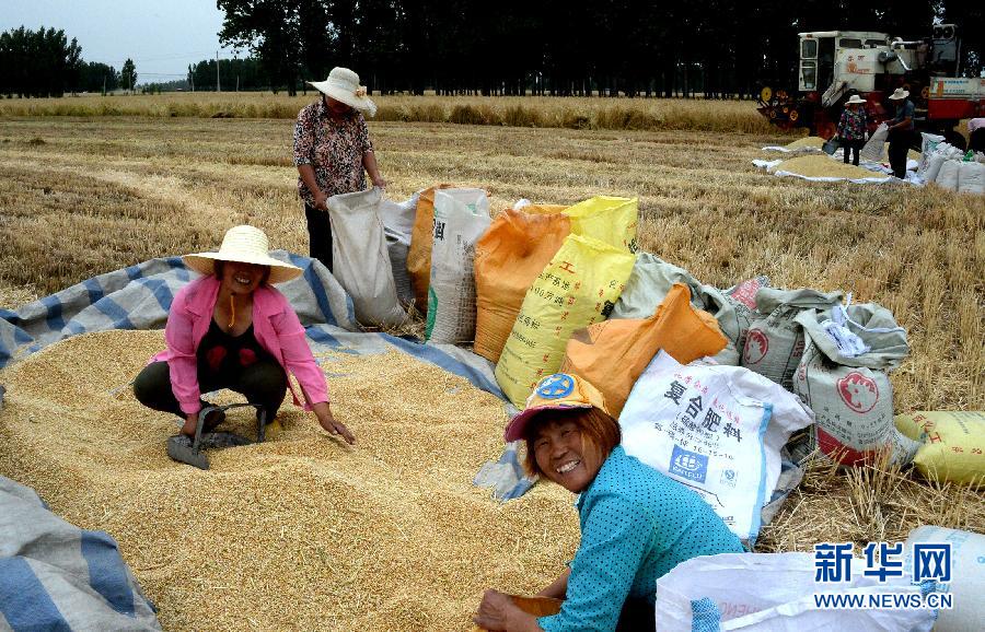 山东省滕州市陈岗村村民在小麦高产田里收获小麦(6月4日摄)。记者近日从山东省有关部门了解到,山东2015年夏粮总产234.73亿公斤,比上年增加8.28亿公斤,喜获丰收。 新华社记者冯杰摄