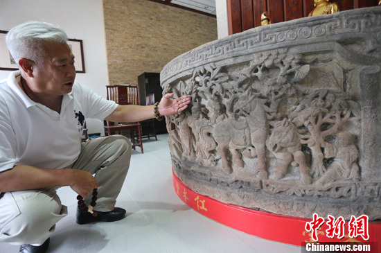 图为7月21日,蒋继明介绍目前国内现存最大的一件宋代石缸。 杨正华 摄