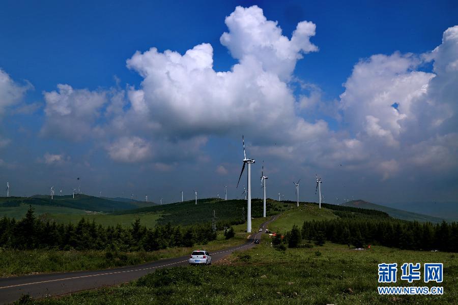 这是张家口坝上地区的一处风电场(7月20日摄)。进入夏季,河北省坝上地区的梯田、草原和农垦区的各类植物郁郁葱葱,鲜花盛开,风景优美。 新华社记者杨世尧摄