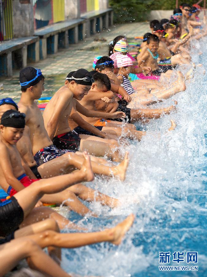 7月22日,孩子们在湖北省咸宁市咸安区旅游中心内练习打水动作。新华社发(吴涛 摄)