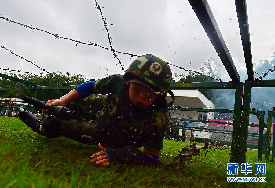 当日,广东边防总队机动支队夏季特种科目大比武在深圳市银湖山训练基地举行,官兵们在湿热的天气里进行了多个特种科目的比拼。 新华社发(廖键摄)