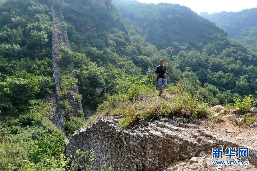 滦平县长城保护员白春向在五道梁段长城上巡视(7月7日摄)。新华社记者牟宇摄