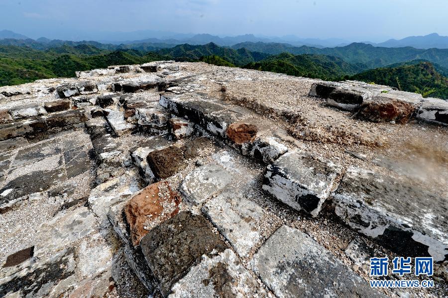 古北口长城一座敌楼斑驳缺损的顶部(7月17日摄)。新华社记者牟宇摄