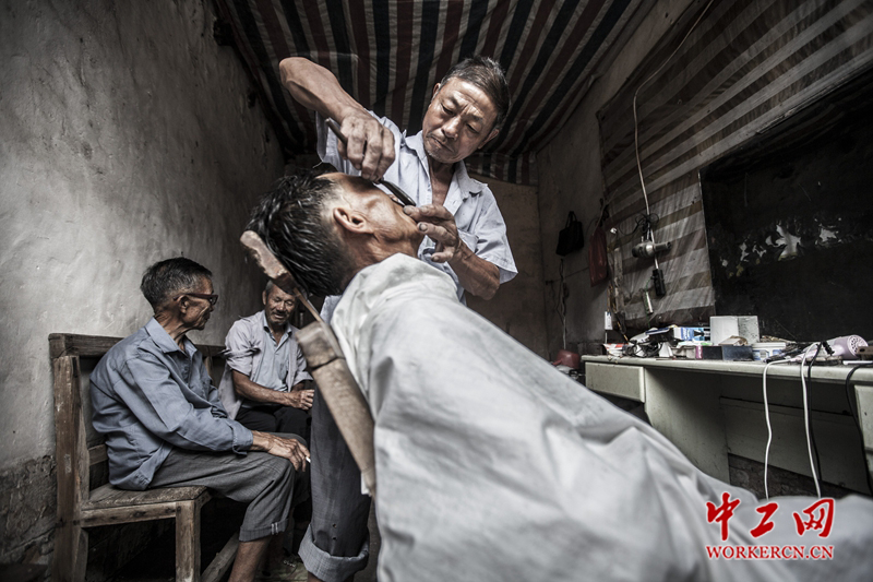 赖学贤,今年67岁,是江西驿前镇的剃头匠。赖学贤说,镇里的理发匠都姓赖,这是这个古镇千年流传下来的不成文的规矩。 中工网记者 韩靖摄