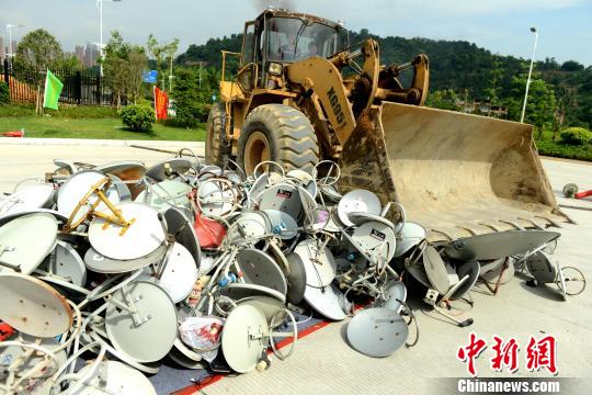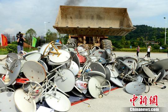 图为现场销毁执法部门缴获的非法“卫星锅”等设备。王东明 摄
