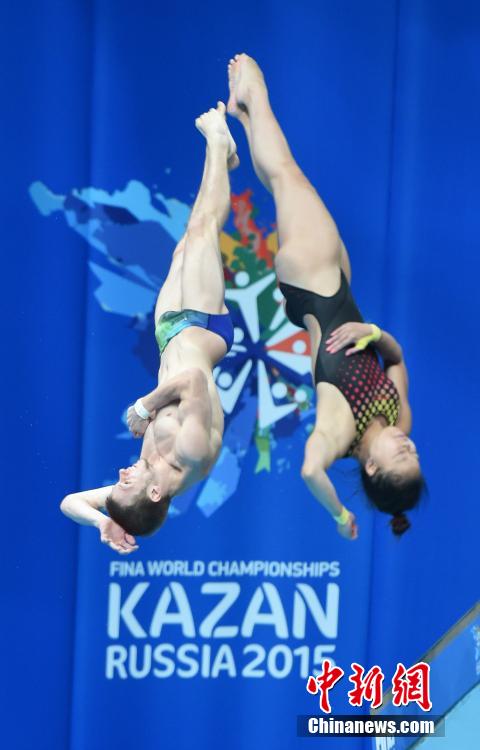 7月24日,一对男女选手在跳水馆进行赛前练习。第16届国际泳联世界锦标赛将于7月24日至8月9日在俄罗斯喀山市举行,本届世锦赛跳水项目新增男女混合3米板、男女混合10米台、全能团体赛三个小项。国际泳联秘书长马库莱斯库表示,这是为了增加世锦赛的观赏性,不断创新和愉悦观众。中新社发 侯宇 摄