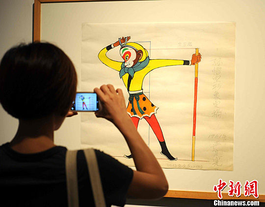 图为观众在参观国产动画片《大闹天宫》中孙悟空的原型。中新社发 崔煜坤 摄