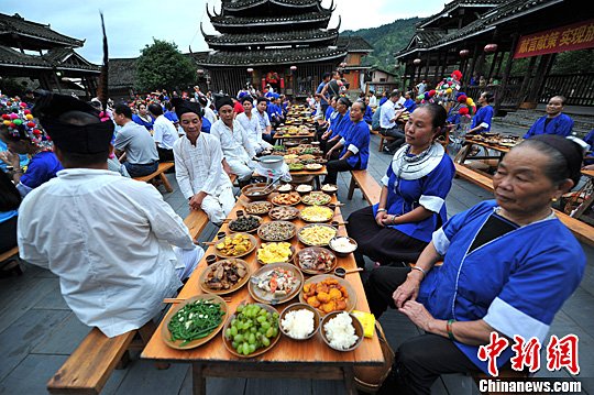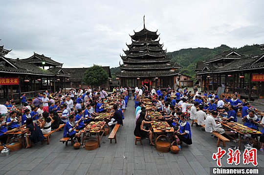 7月23日,广西柳州市三江侗族自治县林溪乡冠洞村冠小屯的群众在鼓楼坪上摆出侗族“百家宴”接待游客。中新社发 胡雁 摄