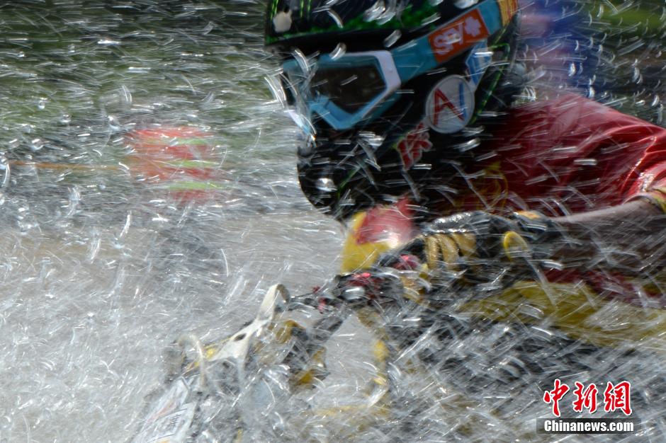 7月26日,来自法国的选手在两轮越野摩托技巧障碍赛决赛中。当日,红牛2015泥石挑战赛决赛在北京怀柔举行,苏善令、许彪、李品容分别获得两轮越野摩托技巧障碍赛、ATV泥浆竞速赛、UTV极限冲坡赛冠军。 中新社发 廖攀 摄