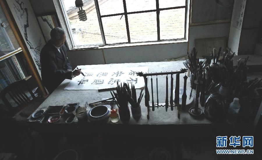 抗战老兵卢彩文在云南腾冲家中练习书法(7月20日摄)。 90岁的抗战老兵卢彩文身体硬朗,走路昂首挺胸。