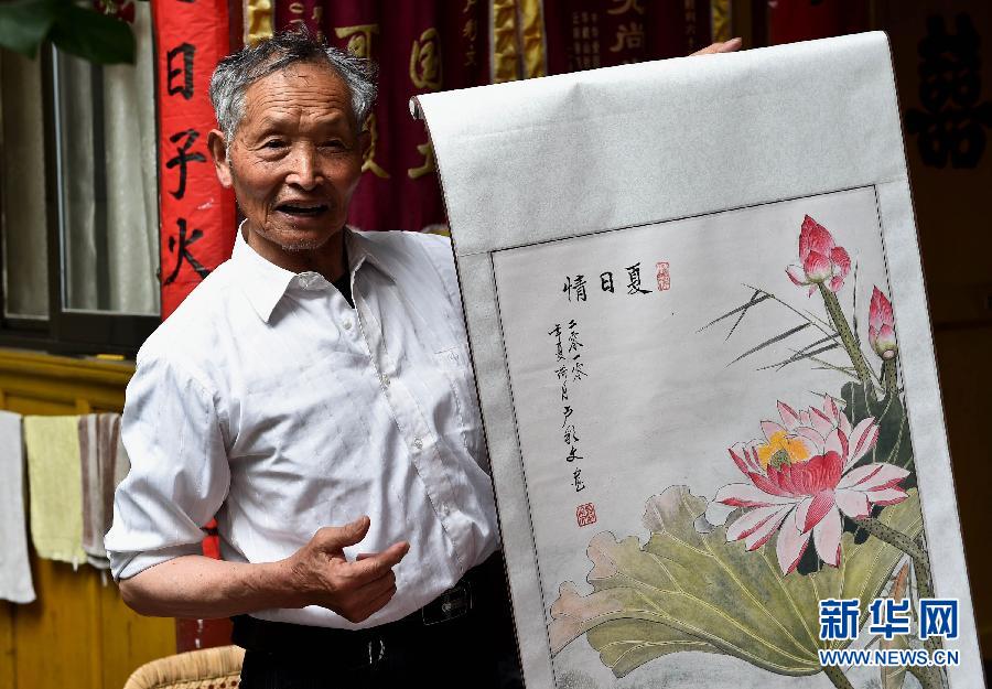 抗战老兵卢彩文在云南腾冲家中展示他创作的书画作品(7月20日摄)。 新华社记者蔺以光摄