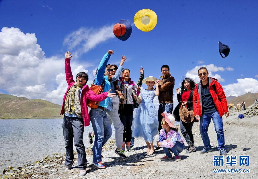游客在羊卓雍错湖畔留影(7月26日摄)。正值旅游旺季,西藏著名景点羊卓雍错吸引了大批游客前来观光。 新华社记者 张汝锋 摄