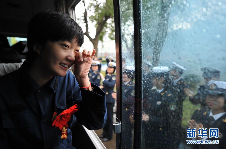 驻浙江舟山海军某部退伍女兵靳京泪别战友(2012年11月25日摄)。