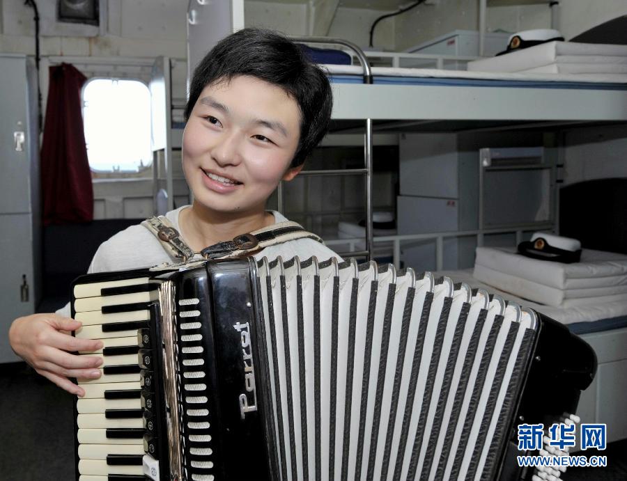 在亚丁湾执行护航任务的海军第七批护航编队“千岛湖”舰上,女兵班战士陈晨演奏手风琴曲《花儿与少年》(2011年1月6日摄)。战士两个字自古以来就不是男人的专利,古时有木兰从军、穆桂英挂帅,放眼今天,军中木兰继续谱写着爱红装更爱戎装的故事。 新华社记者范军威摄