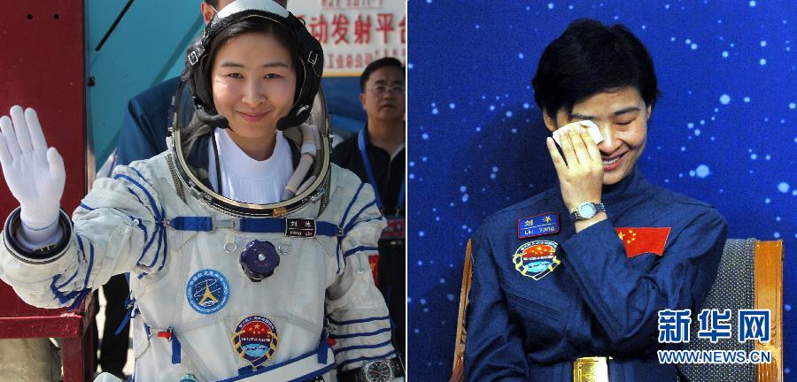 左图,2012年6月12日,中国第一位女航天员刘洋在发射场参加联合演练(新华社记者王建民摄);右图,2012年8月13日,访港神舟九号航天员刘洋在茶话会上回顾成长经历时落泪(廖梓达摄)。