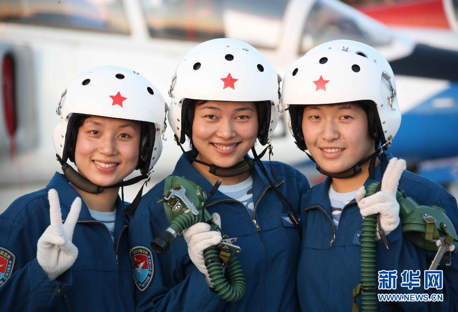 国庆60周年阅兵方阵教练机梯队的三位女飞行员在一起留影(2009年7月14日摄)。战士两个字自古以来就不是男人的专利,古时有木兰从军、穆桂英挂帅,放眼今天,军中木兰继续谱写着爱红装更爱戎装的故事。 新华社记者王建民摄