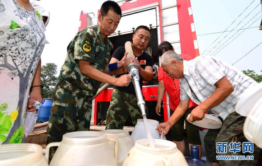 7月28日,在辽宁省大连市金普新区大魏家街道荞麦山村,金州区消防大队金渤海岸中队消防队员为村民供水。 7月初以来,辽宁大连出现严重干旱。旱情造成金普新区荞麦山村300户村民出现生活用水困难。大连市消防局金州区消防大队派出消防车送水到村里,保障村民正常生活用水。新华社发 朴峰 摄 图片来源:新华网