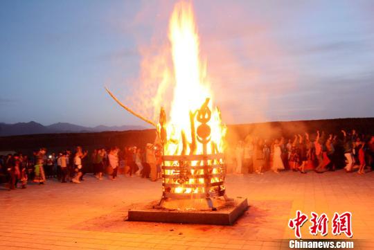 7月27日晚天空繁星点点,地上篝火熊熊,甘肃肃北蒙古族自治县举行那达慕篝火晚会。图为篝火晚会现场。 乌仁花 摄