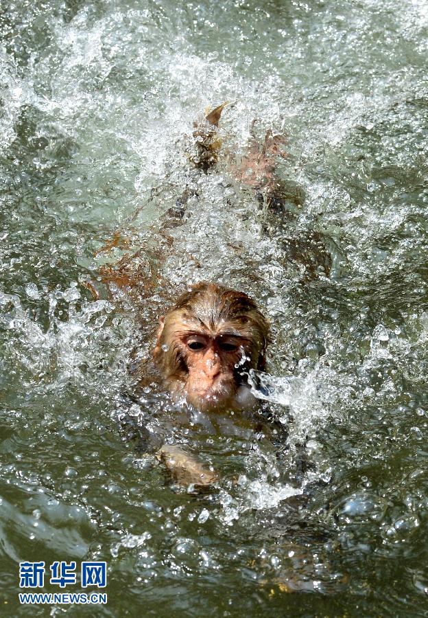 7月28日,在河南省洛阳市王城公园动物园,一只猴子在水池中戏水,享受清凉。 新华社发(高山岳 摄)